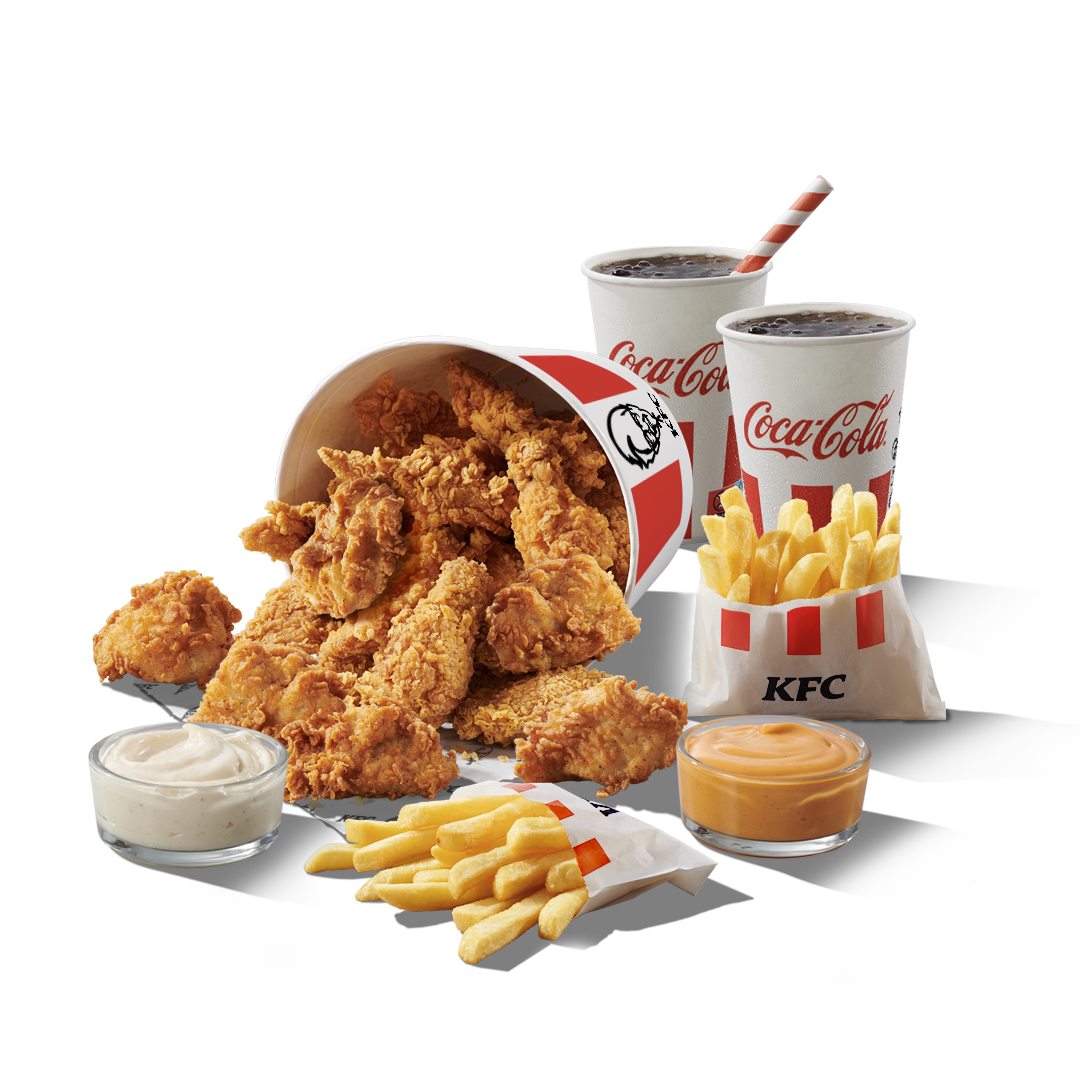 10 KFC Nuggets, 6 куриных стрипсов (оригинальный рецепт или экстра хрустящие), 2 маленьких напитка объемом 0,25 л, 2 маленьких порции картошки фри и 2 порции соуса.