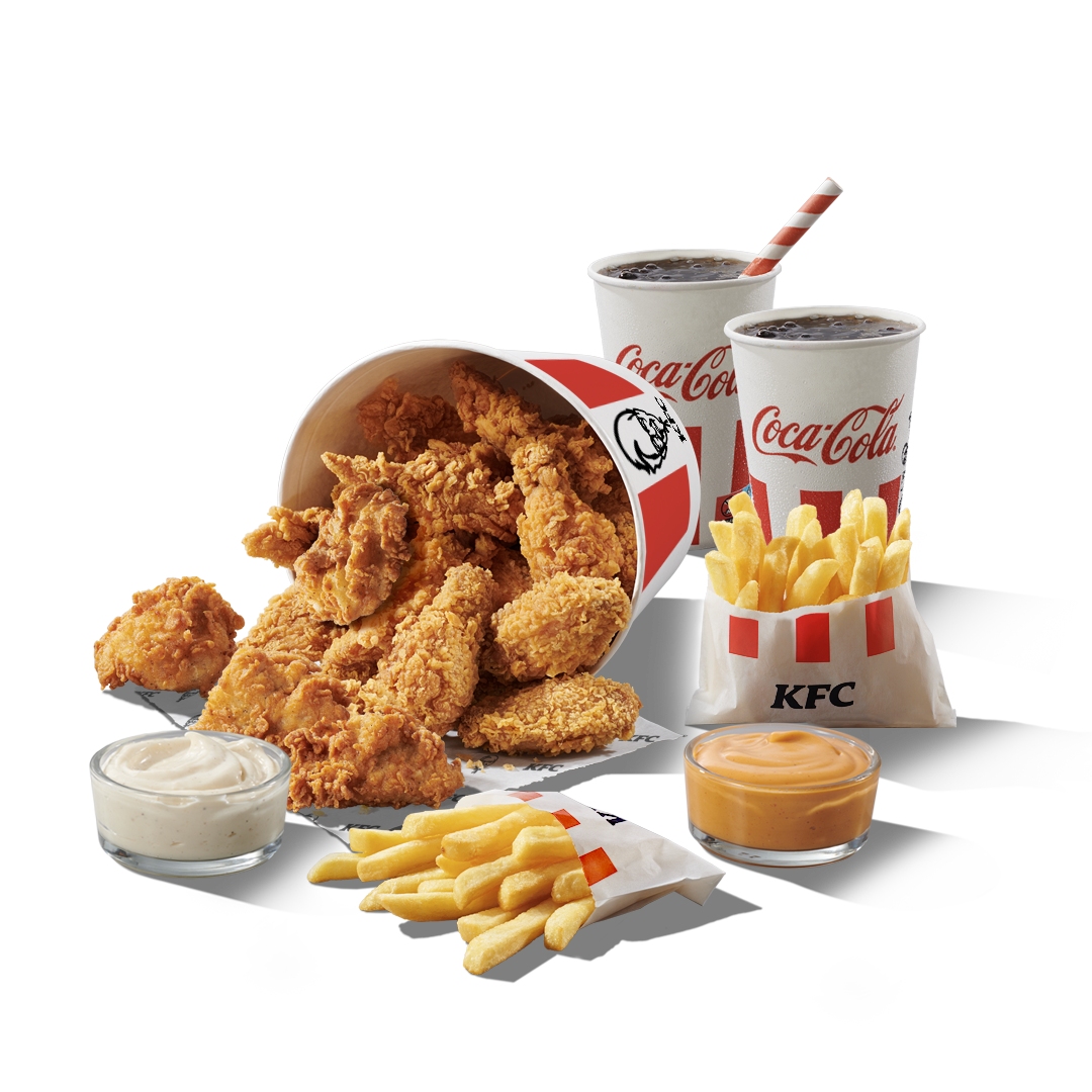 6 KFC Nuggets, 4 куриных стрипса (оригинальный рецепт или экстра хрустящие), 4 острых куриных крылышка, 2 маленьких напитка объемом 0,25 л, 2 маленьких порции картошки фри и 2 соуса.